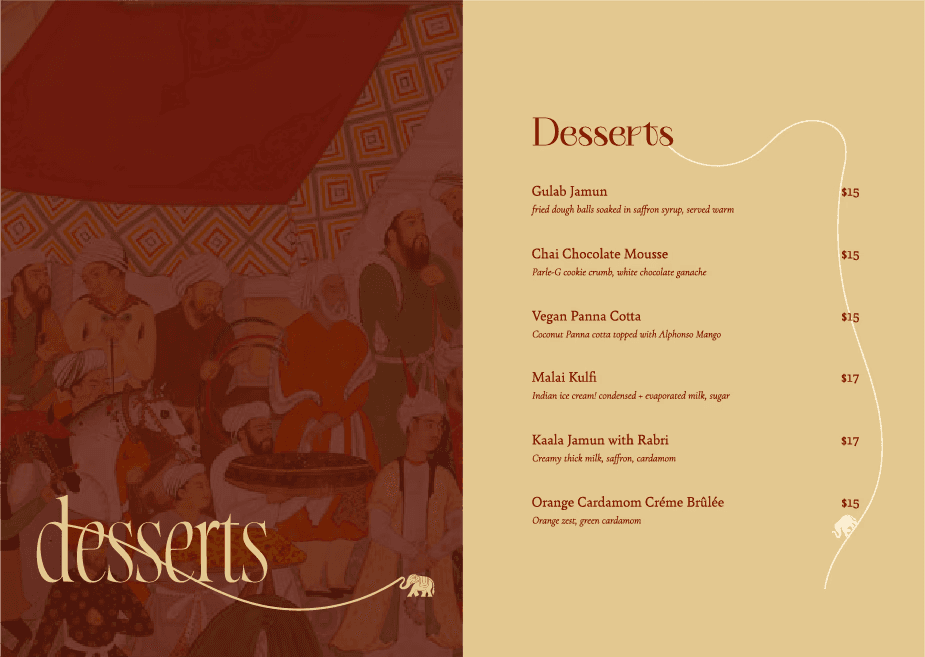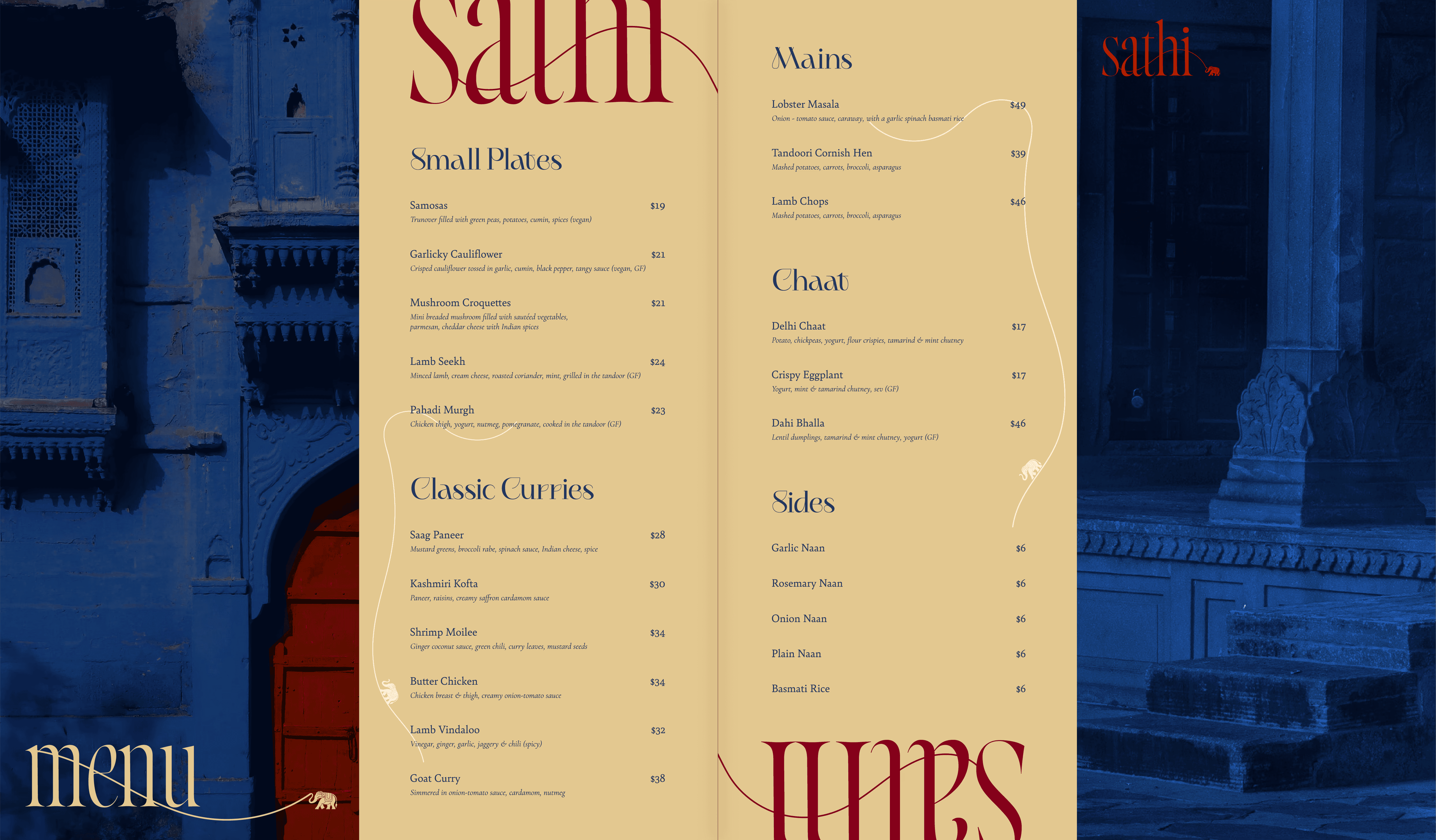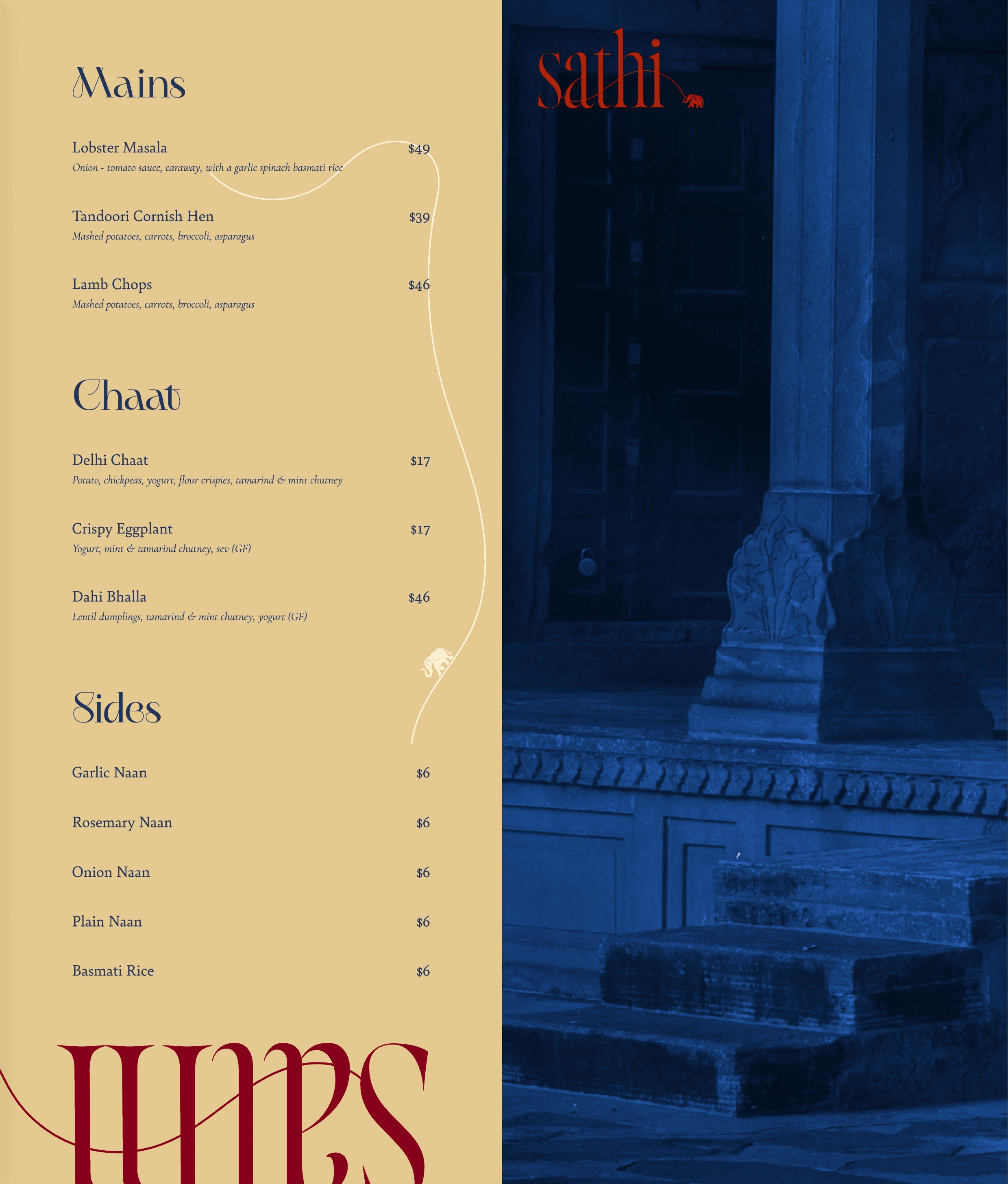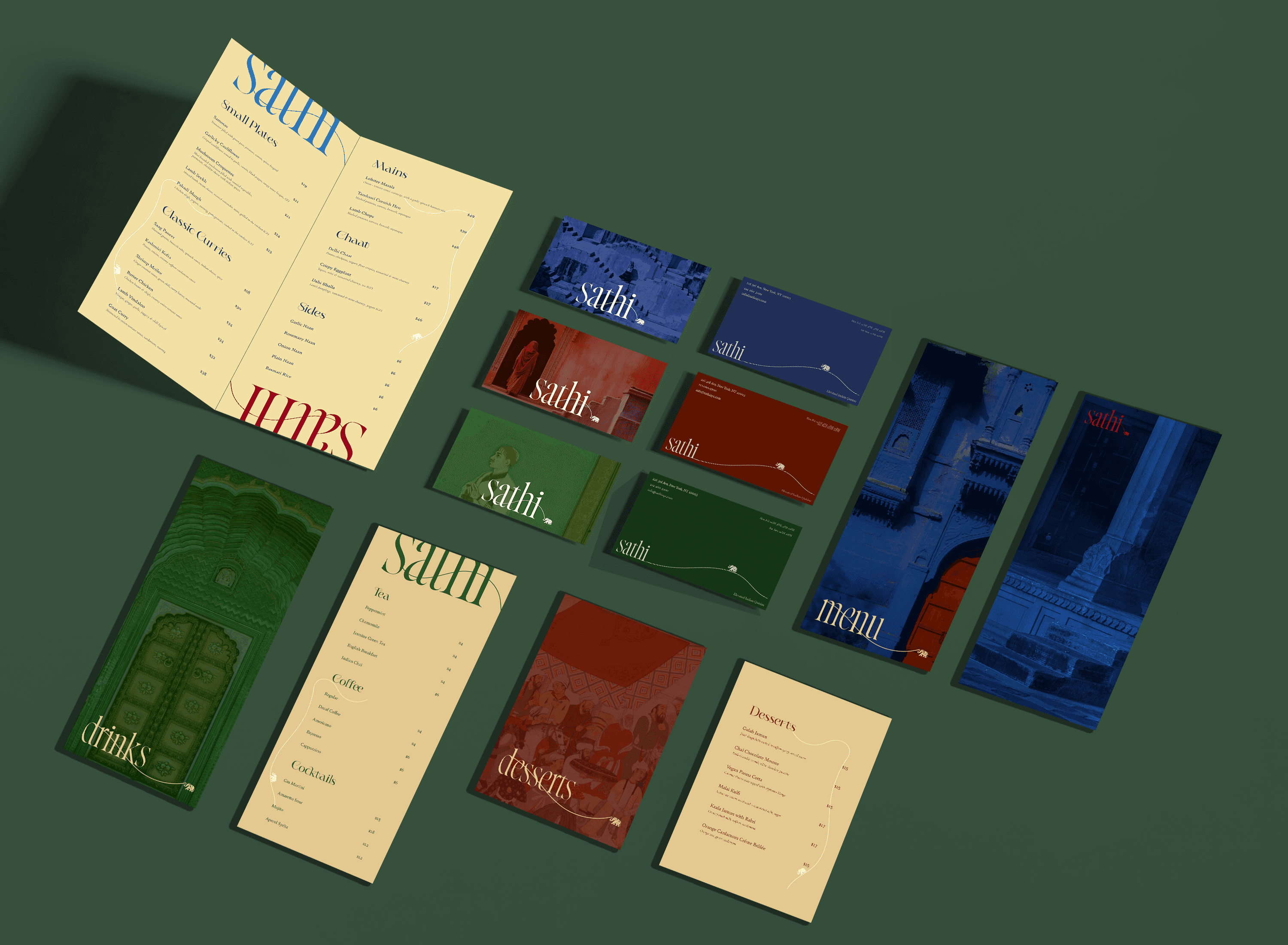 I designed the visual identity for Sathi, an Indian restaurant aiming to offer a refined yet authentic dining experience. To convey a sense of sophisticated cultural depth, I combined photography from Jaipur with classic Mughal illustrations, and a toned down color palette, creating a visual narrative rooted in tradition.